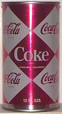 1966 saw another generation change as Coke moved to the Harlequin design that is sometimes indicated as the small diamond can. The first version is available as a flat and a pull top, with the flat top being a much tougher find. The distinction between the first and second version of this can is made by the placement of the "Contents 12 FL OZS". The first version has it at the top, while the second, available only as a pull tab for the first time, shows it at the bottom.