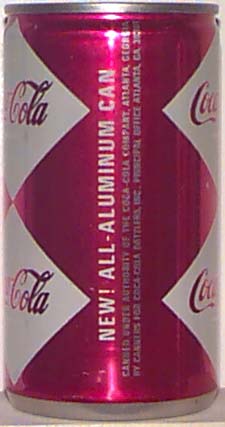 The final version of this can made it's appearance in 1967. It was Coke's first effort at using an all aluminum design. This can is easily distinguished from its predecessor due to the indented ridge at the top lid and the curved aluminum shape at the base with no true bottom lid. In addition, the All Aluminum statement is made on the bottom of the can. A second and more common all aluminum can quickly made it's debute, but this time the all aluminum statement was on the side of the can.