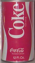 The harlequin designs remained in use until the next generation change which took place in 1970 as coke moved to it's spiral design which we are still familiar with today. Take a look at the first spiral design can, a very difficult to find two panel dull red flap top - notice that the one content line lists "Carmel Colored" as the only item. This can was also available in metallic paint. The second spiral design, released in 1971 had a shorter "Coke" on the side panel, yet still only listed one content line. It is also available in dull red or metallic paint.